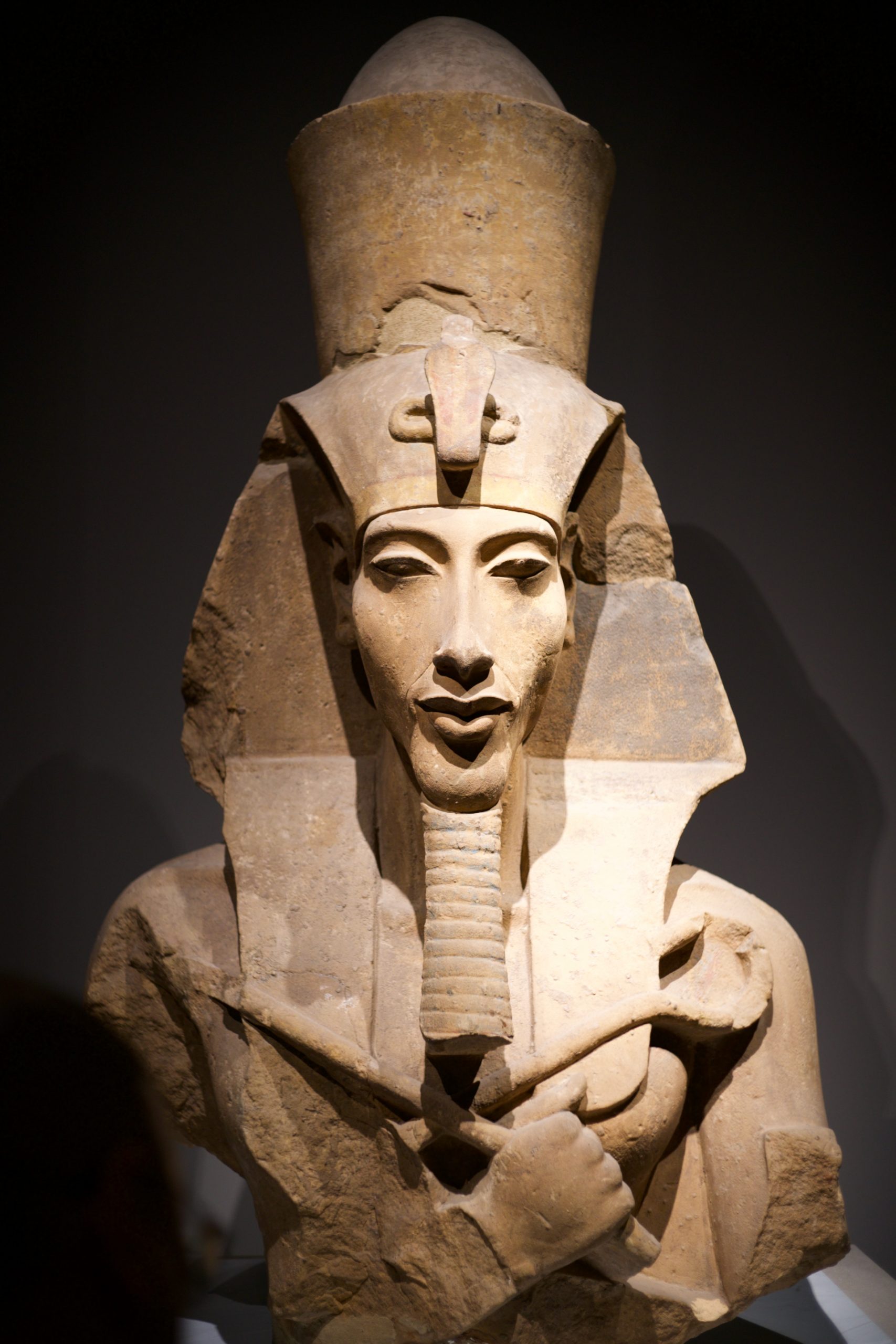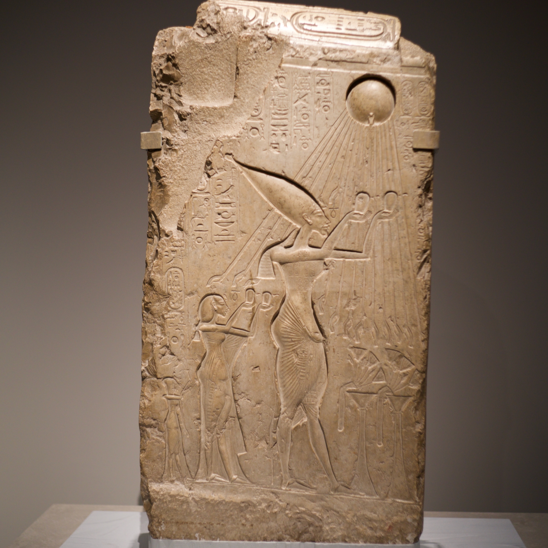 這次展覽中,除了阿肯那頓巨像之外,另有一塊非常觸目的石碑,碑上描繪阿肯那頓敬拜阿頓神,他體積最大也是代表身分地位最高,其次是他妻子娜芙蒂蒂(Nefertiti)與三名女兒,是阿肯那頓宗教改革的典範文物。 阿肯那頓的宗教改革包括遷都,埃及王國的首度從孟菲斯(Memphis)搬到阿瑪拿(Amarna),這段時期的埃及歷史稱為阿瑪拿時代。埃及學家 James K. Hoffmeier 指出,阿肯那頓是世界上第一位「單一神主義者」,從摩西而出的單一神主義信仰的源頭或許也是這位「異端」法老4。